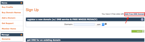 左メニューの”Add a Domain”を開くと、新ドメインの登記・DNS取得・逆引きDNSの登録と入力フォームが並んで迷うかもしれないが、ここは右上に小さくある”Add Free DNS Domain”リンクをクリックする。